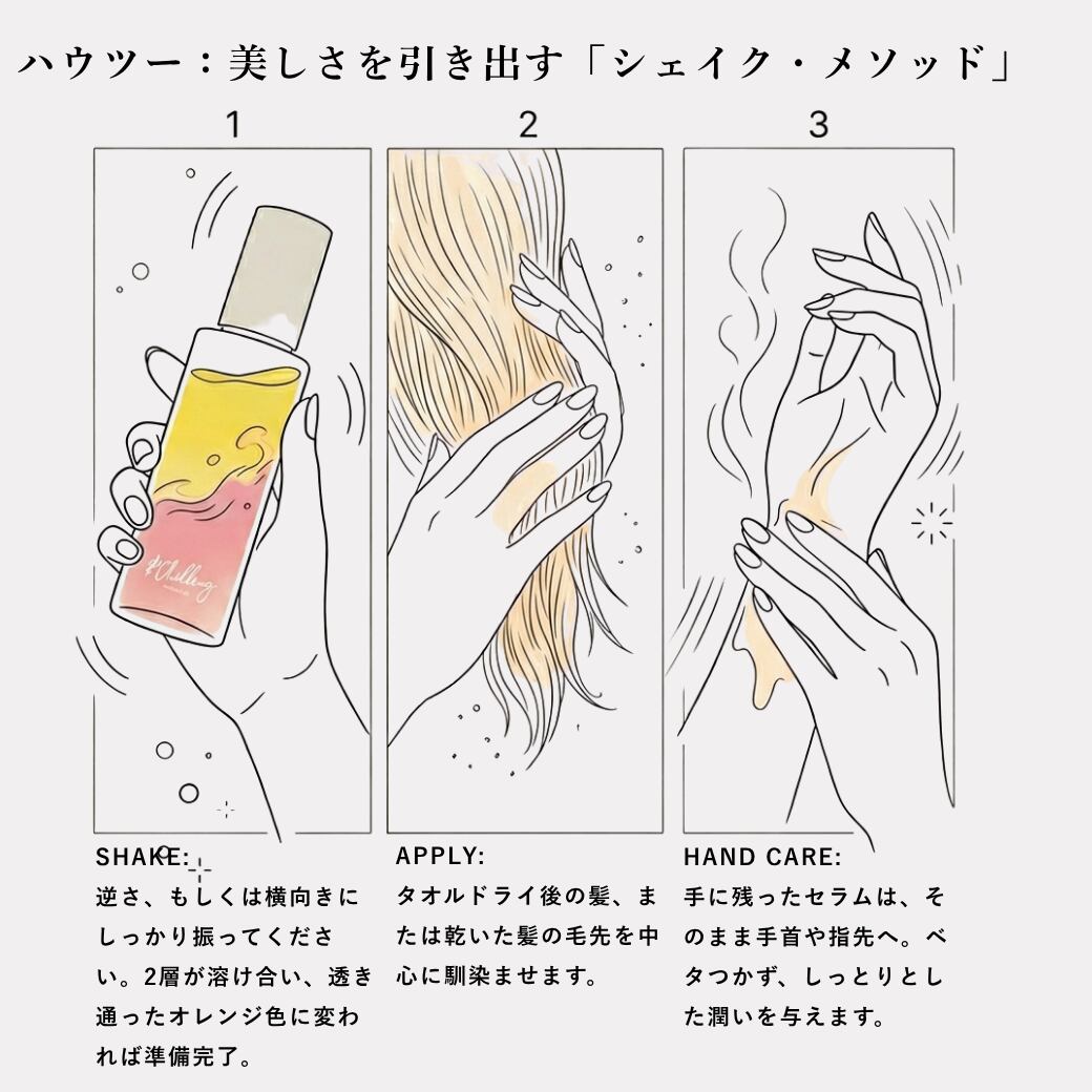 適量を手のひらにでよく伸ばして毛先を中心に塗布し、毛髪全体に馴染ませてください。均一になるまでよく振ってからご使用ください。適量を手にとり、髪や肌にムラなくのばしてください。タオルドライ後の毛髪に塗布していただくとより効果的に仕上がります。使い始めは、垂直に振っても混ざりにくいため、ピンクの層が上を向くように「逆さ」もしくは「横向き」に振っていただきますと均一に混ざりやすくなります。